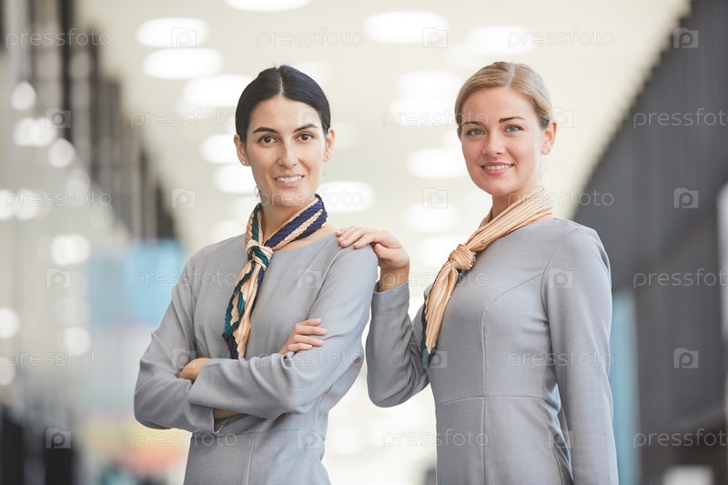 Две улыбающиеся стюардессы в аэропорту