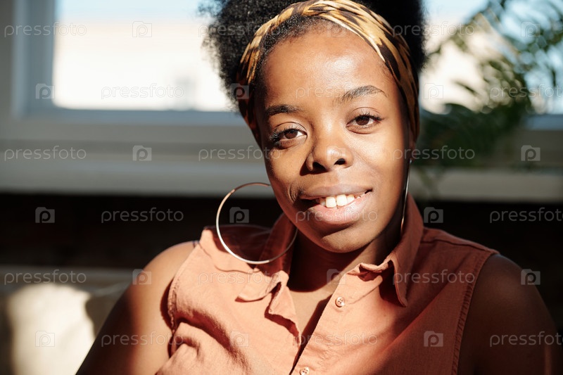 Молодая веселая женщина африканской этнической принадлежности смотрит на тебя с зубчатой улыбкой
