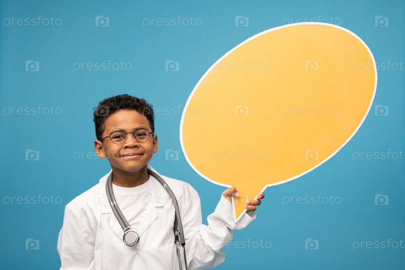 Милый маленький африканский или смешанный врач, держащий пустой желтый пузырь речи
