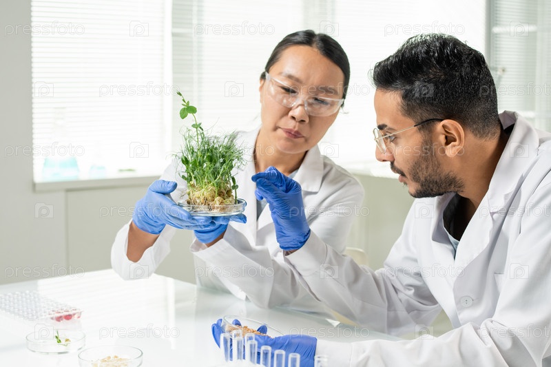 Учёная-женщина держит зеленые лаборанты соевых побегов, в то время как мужчина собирается взять один