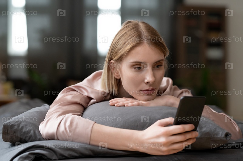 Молодая блондинка в бежевой шелковой пижаме делает селфи или прокручивает новости