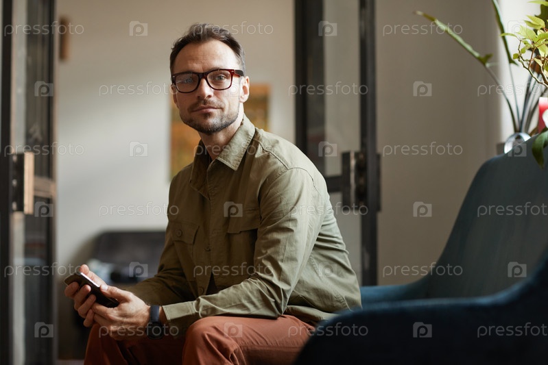 Бизнесмен с телефоном сидит в офисе
