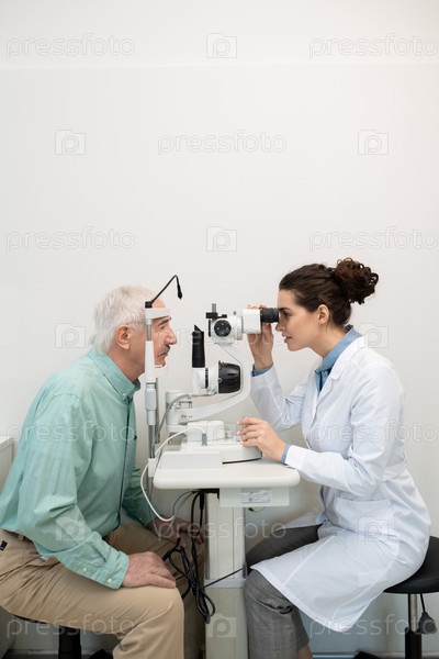 Боковой вид молодого брюнетки офтальмолога, проверяющего зрение старшего мужчины