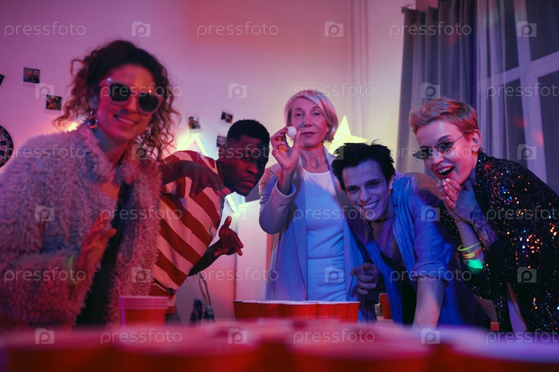 Зрелая женщина играет в пивной понг