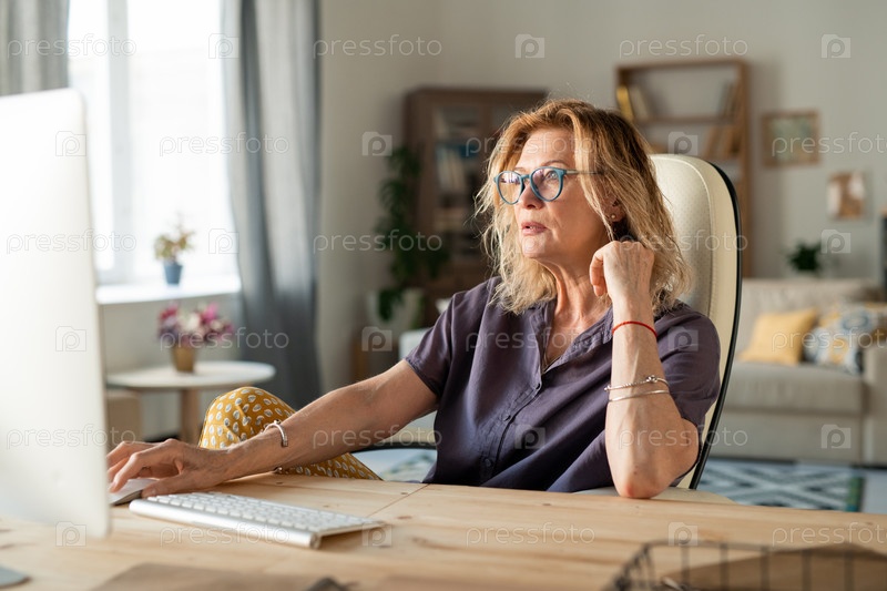 Серьезная зрелая деловая женщина в повседневной одежде, сидящая дома перед компьютером