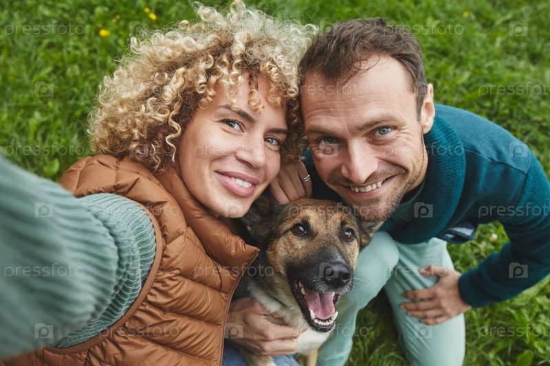 Молодая счастливая пара с собакой