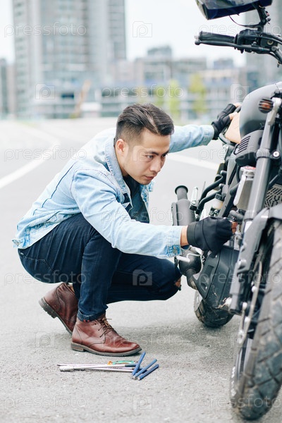 Мужчина, ремонтирующий мотоцикл