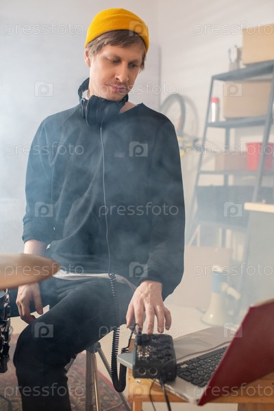 Серьезный молодой музыкант в повседневной одежде нажимает кнопку, чтобы начать записывать программное обеспечение