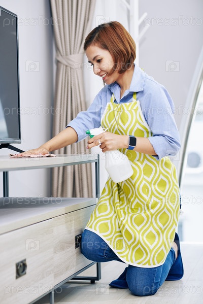Домашняя хозяйка дезинфицирует поверхности