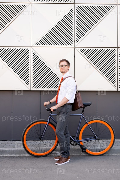 Молодой элегантный бизнесмен с велосипедом, стоящий на асфальтированной дороге против стены