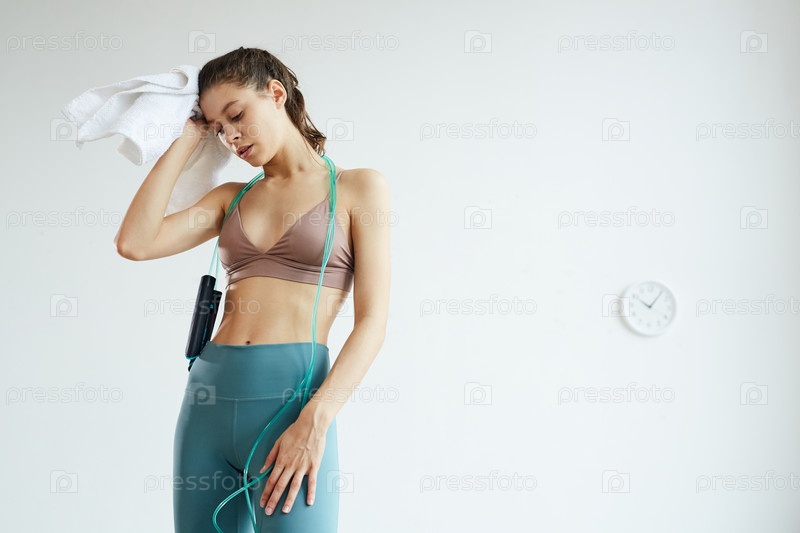 Измученная молодая женщина держит скакалку