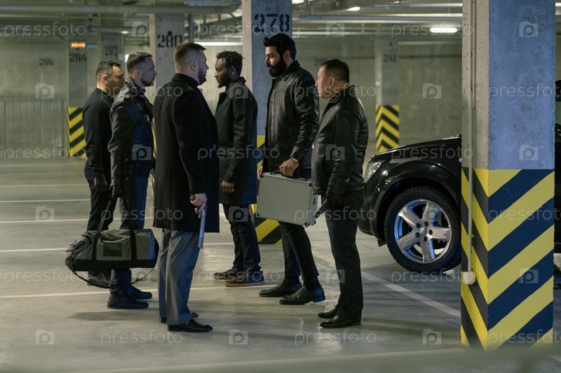 Две группы убийц в черном с пистолетами и сумками взаимодействуют друг с другом