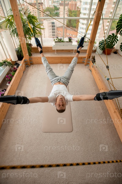 Молодой спортсмен в спортивной одежде, висящий над полом во время тренировки воздушной йоги