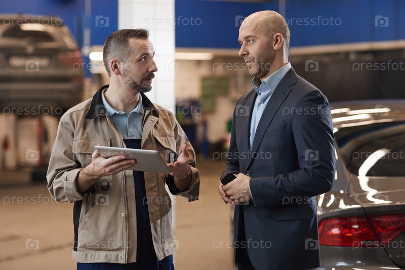 Автомеханик разговаривает с бизнесменом
