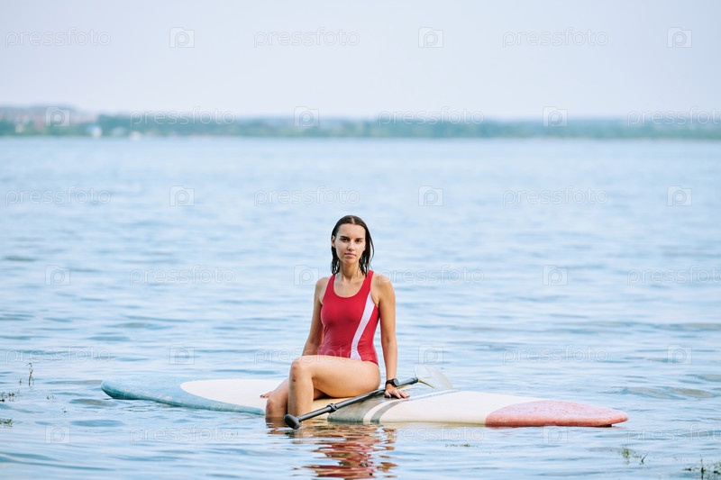 Молодая влажная расслабленная женщина в красном купальном костюме сидит на доске для серфинга и плавает
