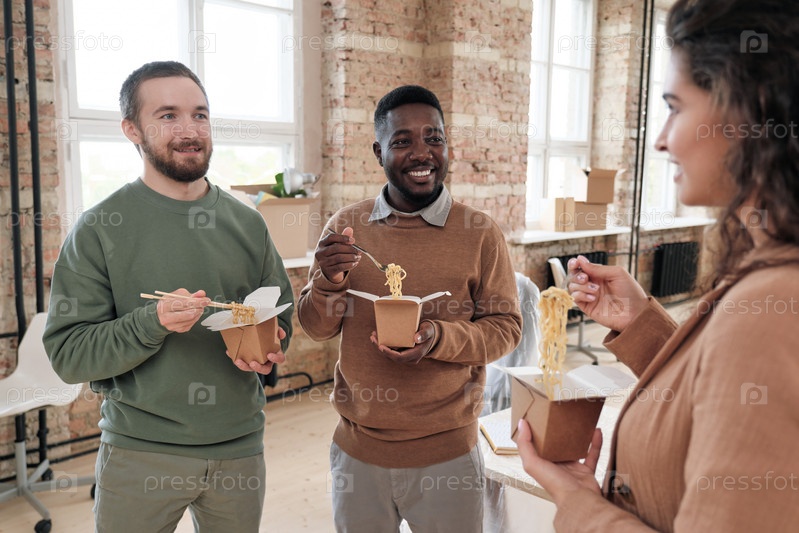 Группа веселых молодых мультиэтнических коллег, стоящих в кругу и едят китайскую еду во время обсуждения нового офиса после реконструкции