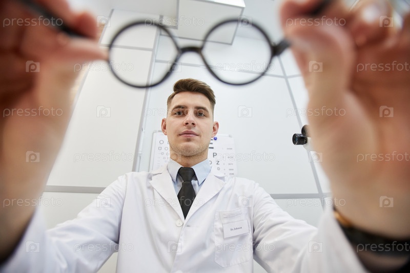 Оптический специалист, держащий очки