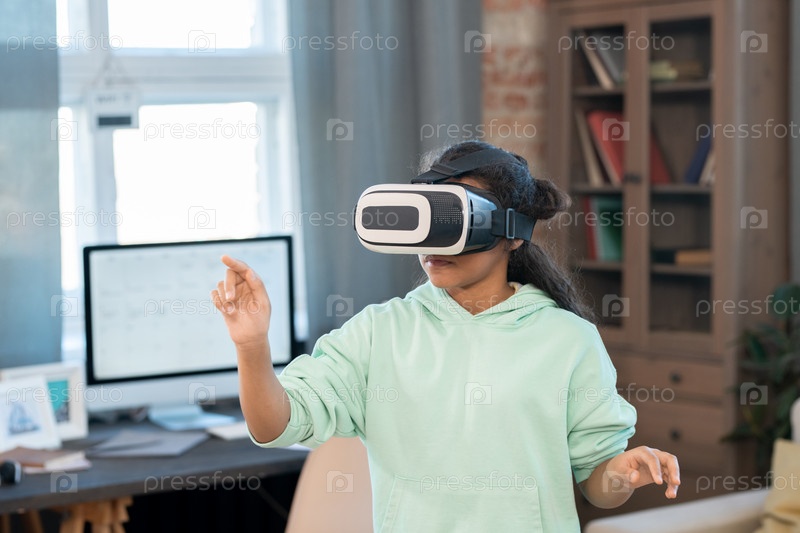 Смешанная раса девушка в VR гарнитуре касается виртуального дисплея во время просмотра видео