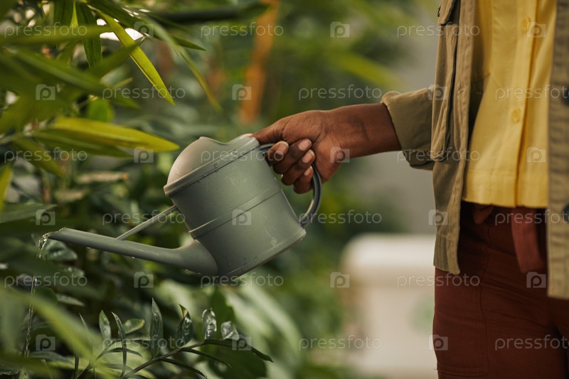 Афроамериканская женщина орошает растения Close Up