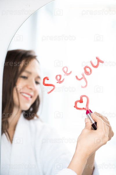 Рука счастливого женского письма вижу тебя и рисую сердце с помадой на зеркале