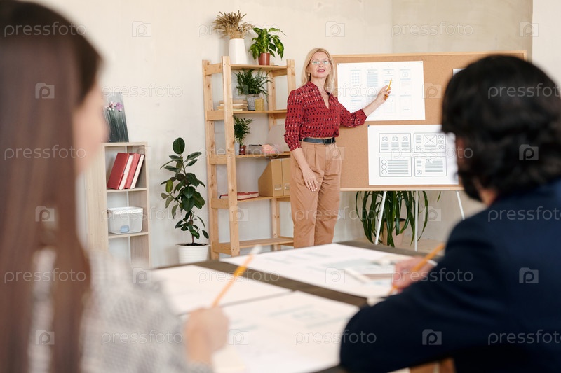 Зрелая деловая женщина в умной повседневной одежде указывает на эскиз мобильного приложения