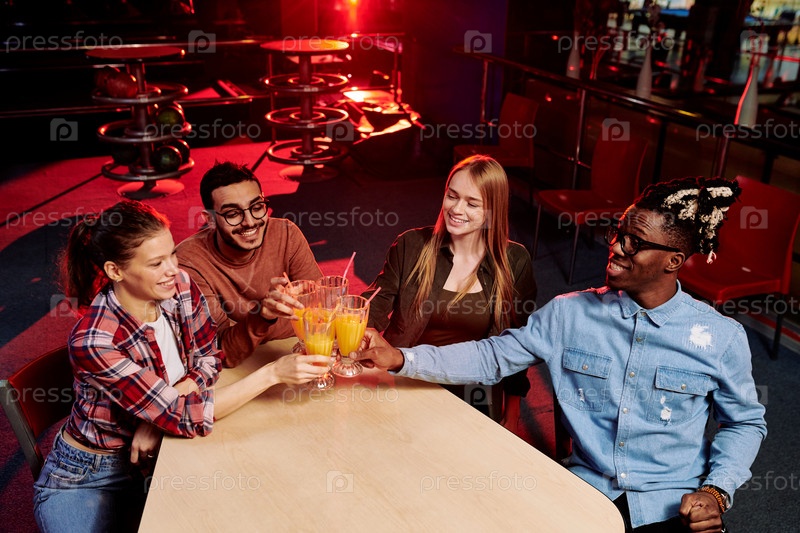 Четыре мультиэтнических друзей в повседневной одежде, колочущие со стаканами апельсинового сока