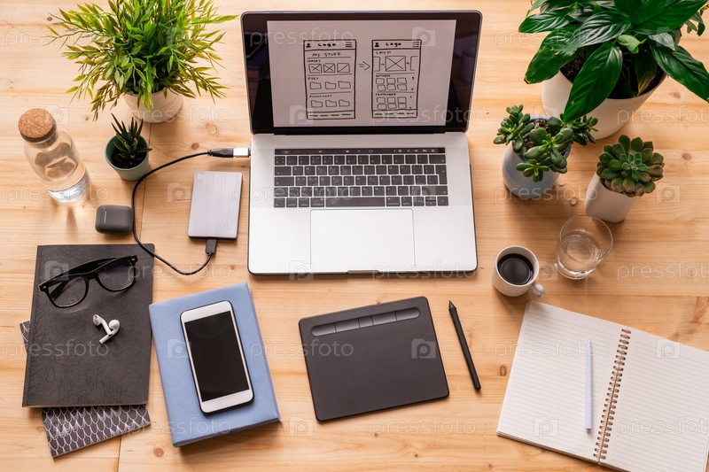 Плоскость рабочего места архитектора или дизайнера с гаджетами и другими вещами