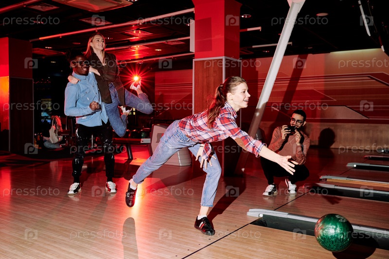 Девушка бросает мяч в боулинг, пока ее друзья фотографируются и выражают радость