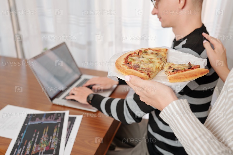 Жена приносит пиццу рабочему мужчине