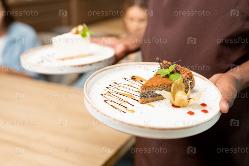 Руки официанта держат тарелку с вкусным пирогом из листьев мяты и шоколада