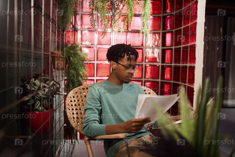 Афроамериканский бизнесмен, работающий в современном интерьере