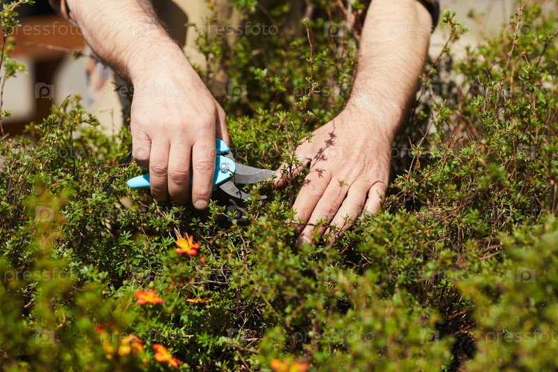 Садовник вырезает растения, закрывая их