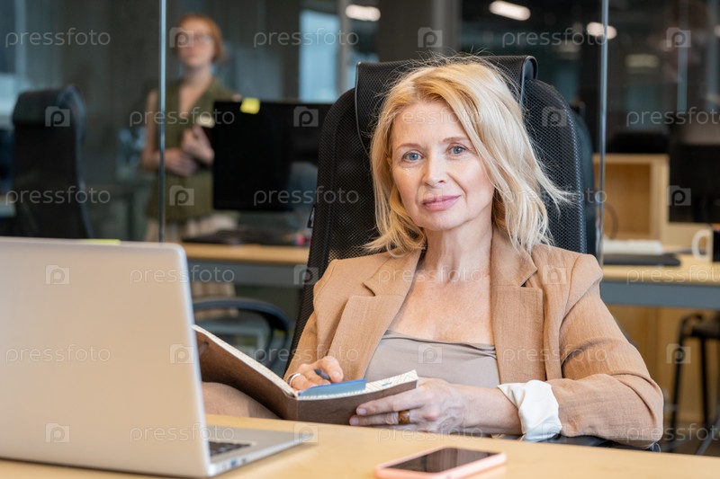 Современная зрелая блондинка-бизнесвумен с открытым блокнотом, делающая заметки
