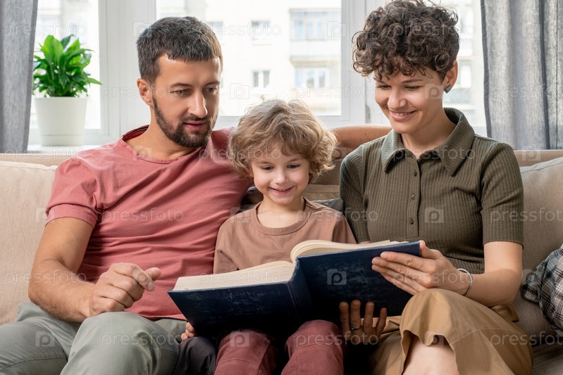Красивая молодая женщина, ее муж и их очаровательный маленький сын читают вместе