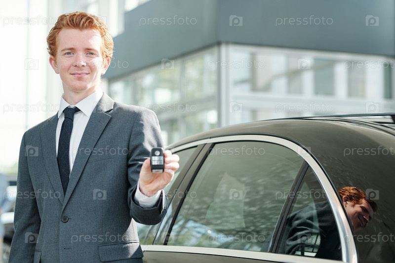 Мужчина-продавец автомобилей в автоцентре показывает покупателю систему тревоги с дистанционным управлением