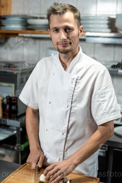 Молодой профессиональный мужской шеф-повар в белой форме смотрит на вас во время приготовления пищи