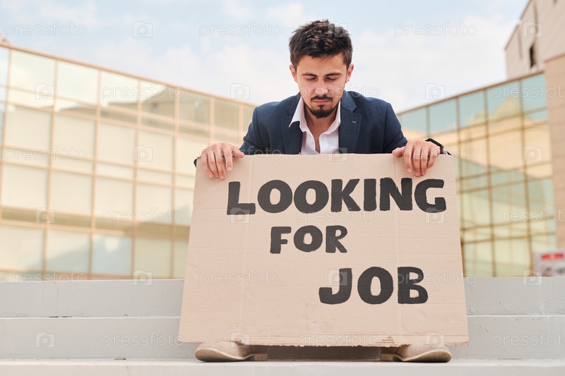 Молодой разочарованный мужчина смотрит на кусок картона с уведомлением о том, что ему нужна работа