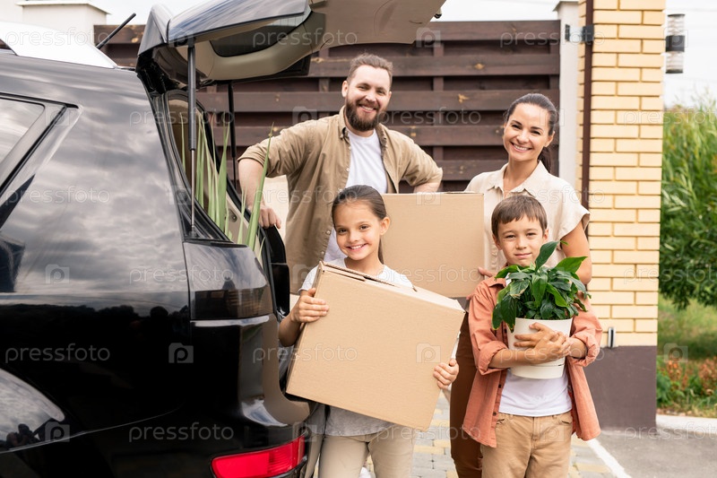 Веселая семья с коробками для переезда