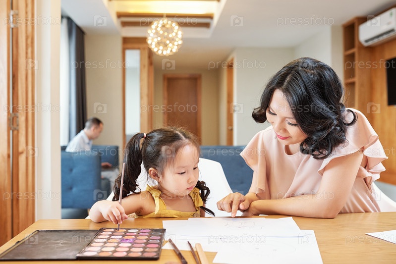 Мать разговаривает с рисующей дочерью