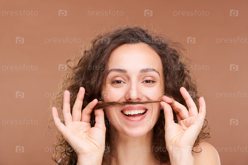 Веселая женщина с зубчатой улыбкой, держащая кучу волос между ртом и носом