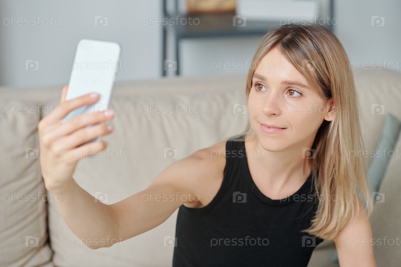 Молодая улыбающаяся блондинка в черном жилете смотрит на камеру смартфона