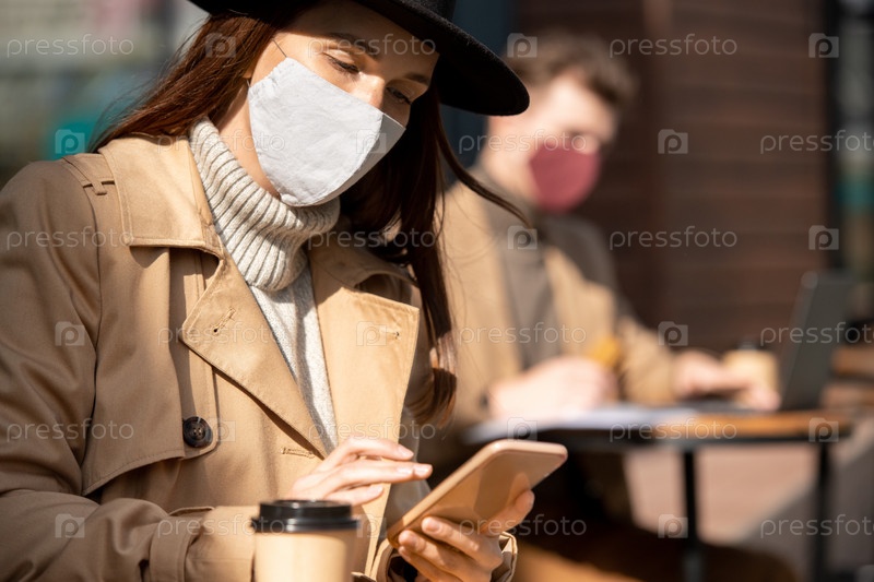 Молодая элегантная брюнетка-бизнесменка в шляпе, плаще и защитной маске