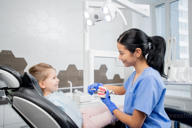 Красивый молодой стоматолог в синей форме показывает маленькому пациенту, как чистить зубы