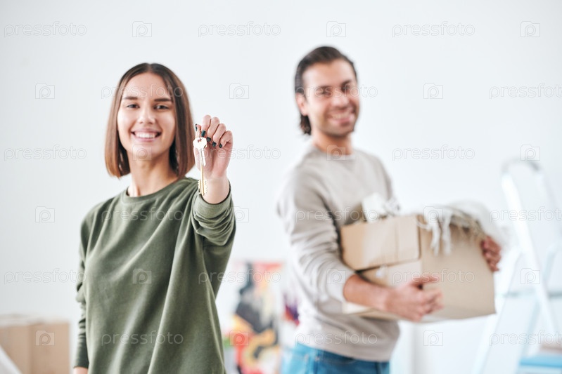 Красивая молодая женщина с зубчатой улыбкой, показывающая тебе ключ от новой квартиры или дома