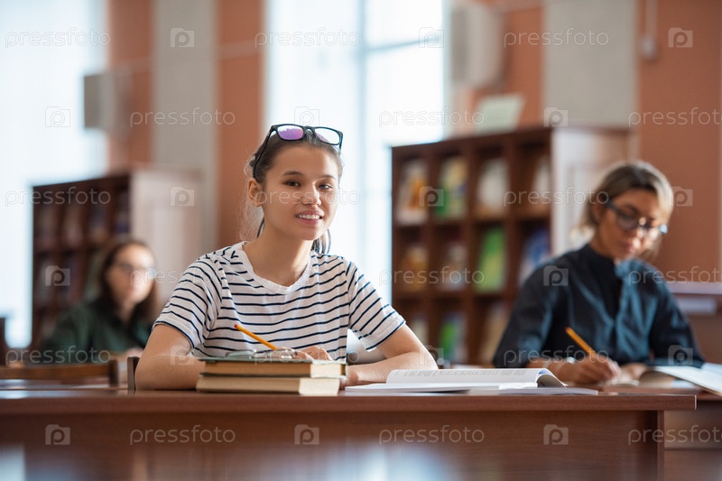 Улыбающаяся девушка-подросток в повседневной одежде смотрит на тебя, сидя в библиотеке