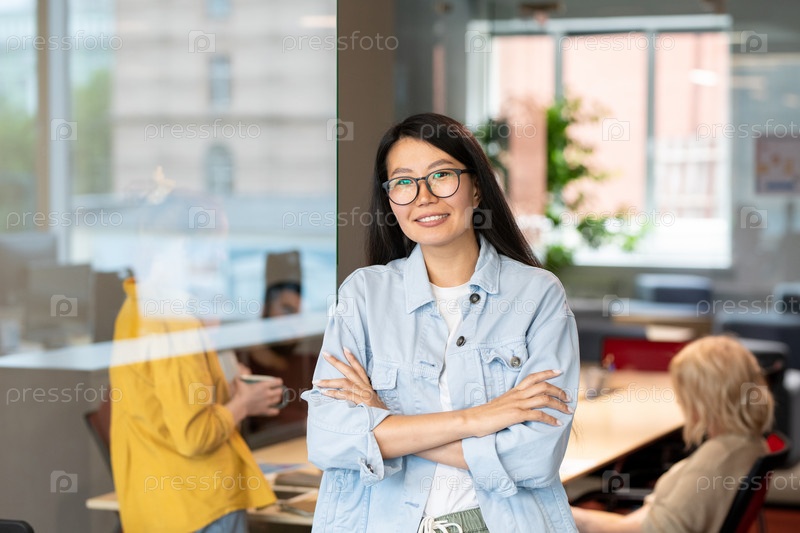 Счастливая молодая азиатская бизнесвумен в джинсовом куртке, скрестившая руки за грудь