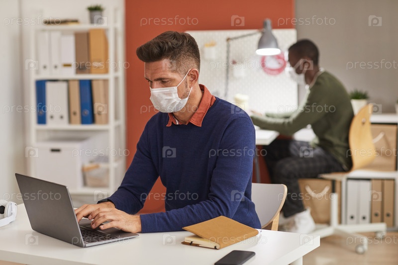 Зрелый мужчина, носящий маску на рабочем месте