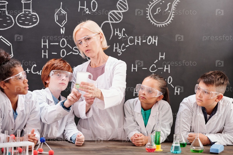 Учитель химии в белом халате показывает смесь двух химических веществ