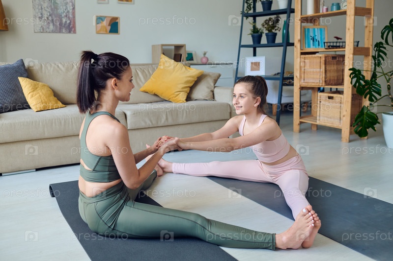 Мать помогает дочери растягивать ноги
