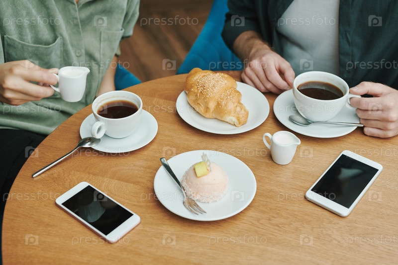 Вид сверху неузнаваемого мужчины, фотографирующего черный кофе и кроассан на столе в кафе, концепция стиля жизни блогеров